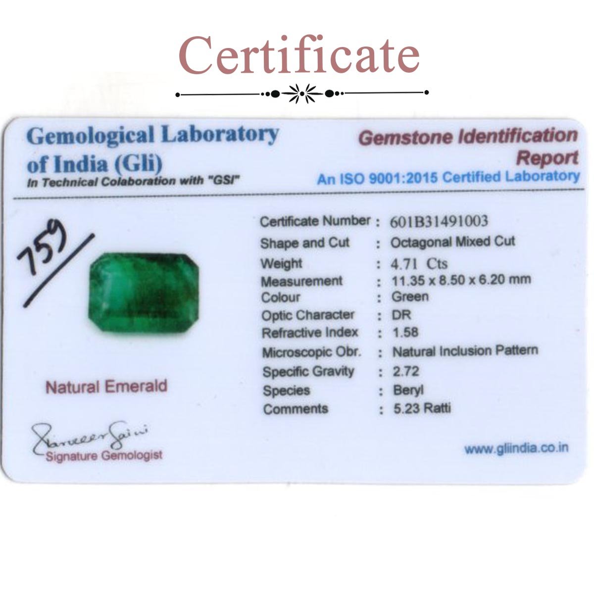 4.71 carats Emerald ( 5.23 ratti Panna )