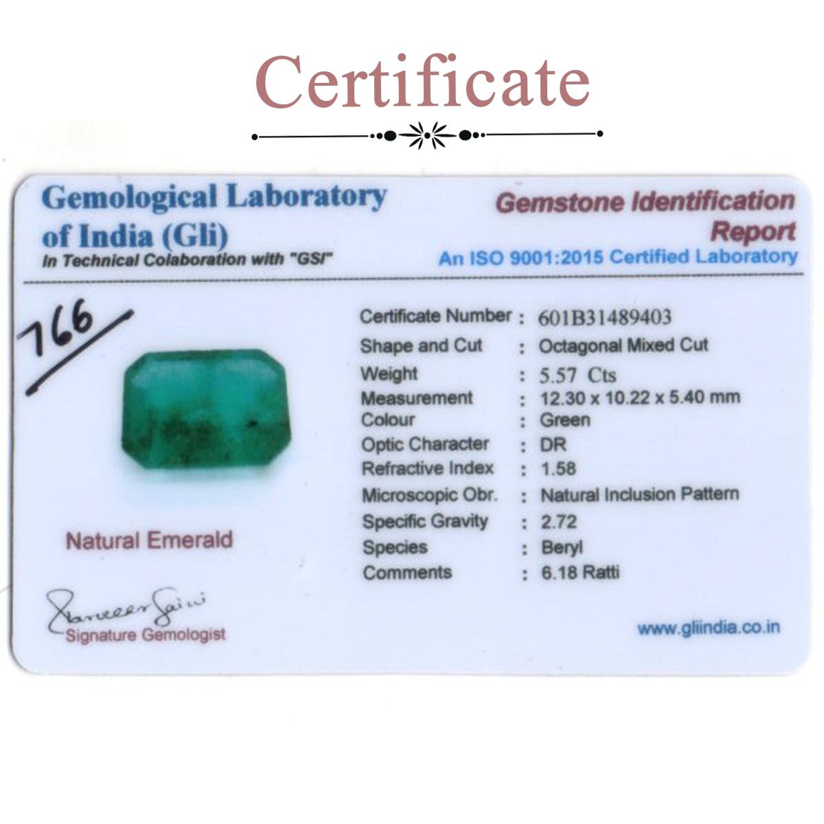 5.46 carats Emerald ( 6.07 ratti Panna )
