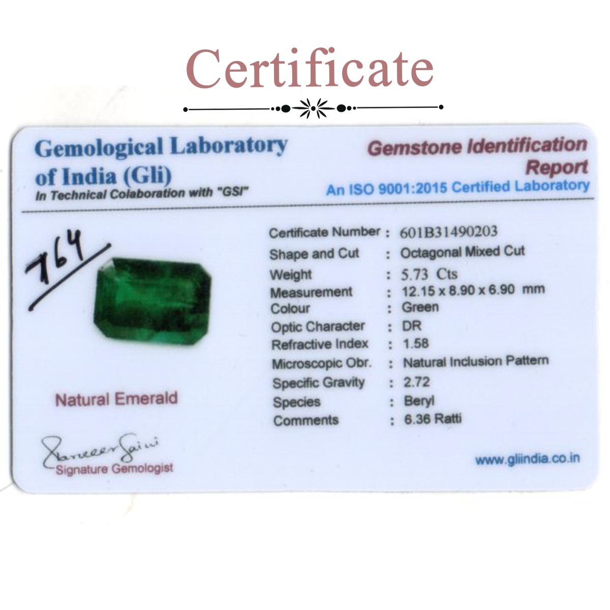 5.73 carats Emerald ( 6.37 ratti Panna )