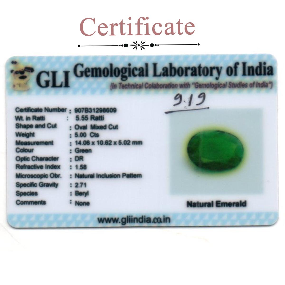 | Certification | Certified from GLI (Gemological Laboratory of India) |