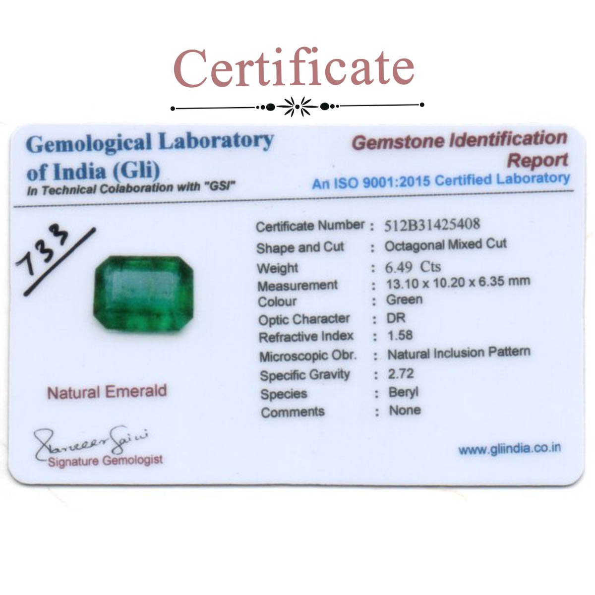 6.49 carats Emerald ( 7.21 ratti Panna )
