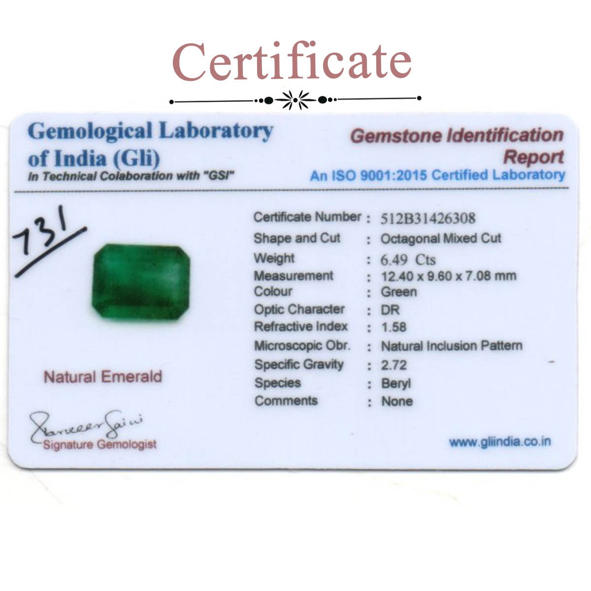 6.49 carats Emerald ( 7.21 ratti Panna )