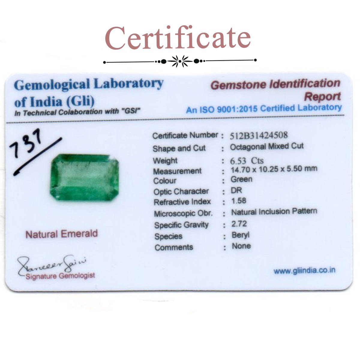 6.53 carats Emerald ( 7.26 ratti Panna )