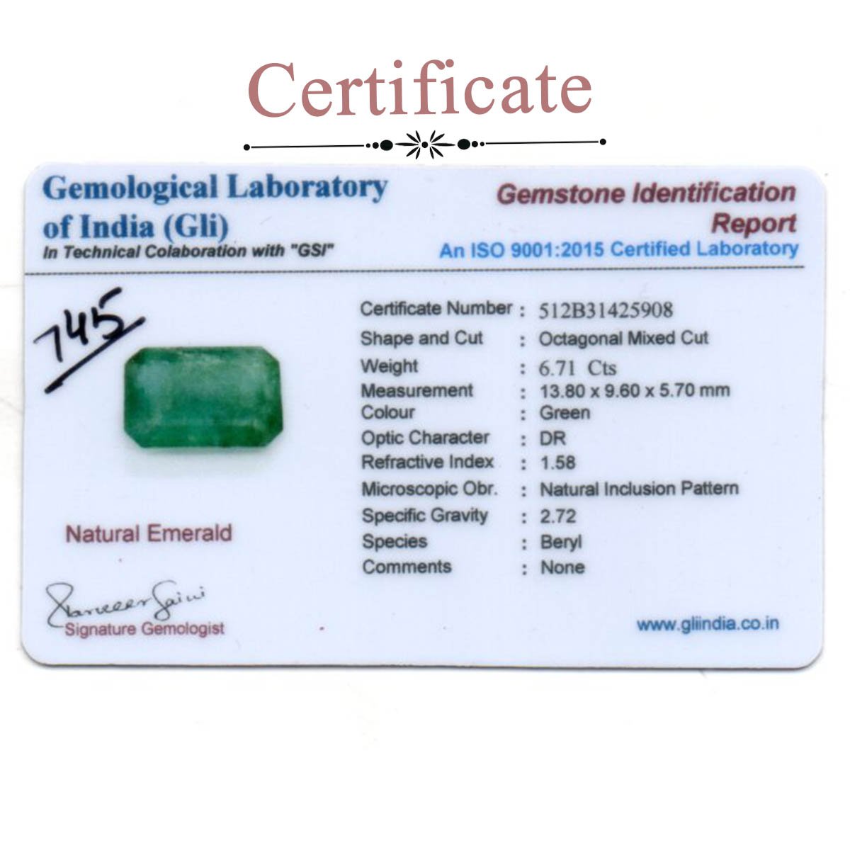 6.71 carats Emerald ( 7.46 ratti Panna )