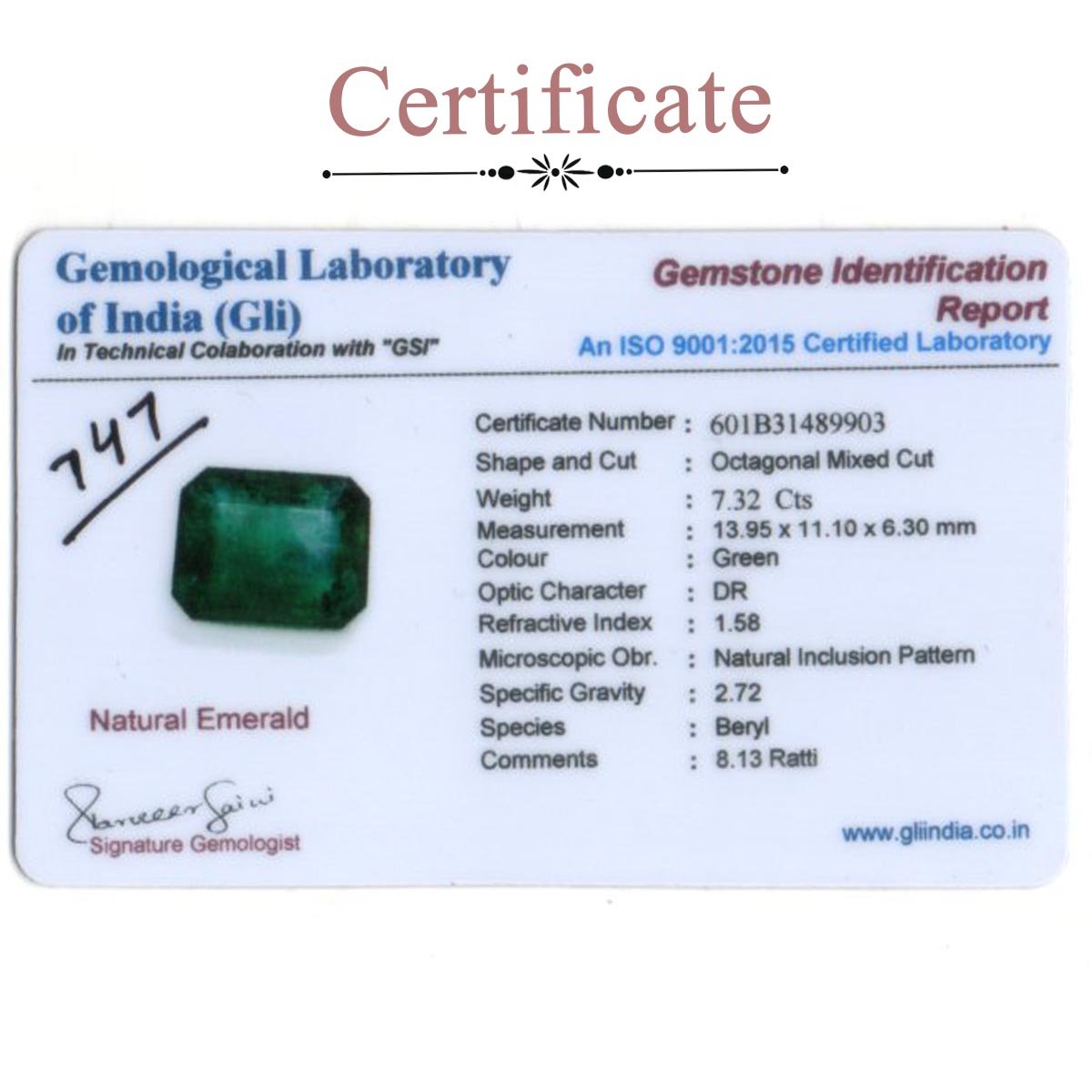 7.32 carats Emerald ( 8.13 ratti Panna )