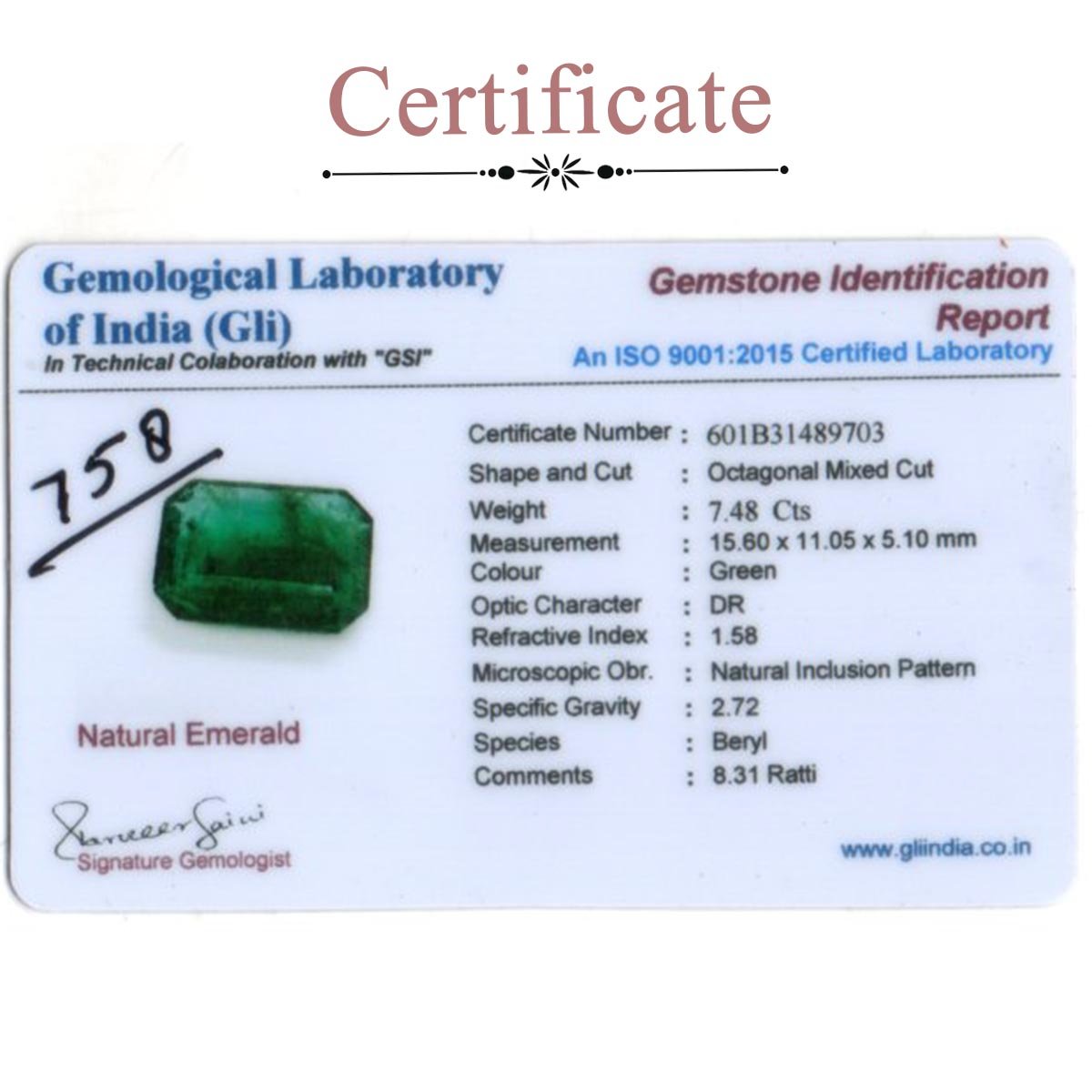 | Certification | Certified from GLI (Gemological Laboratory of India) |