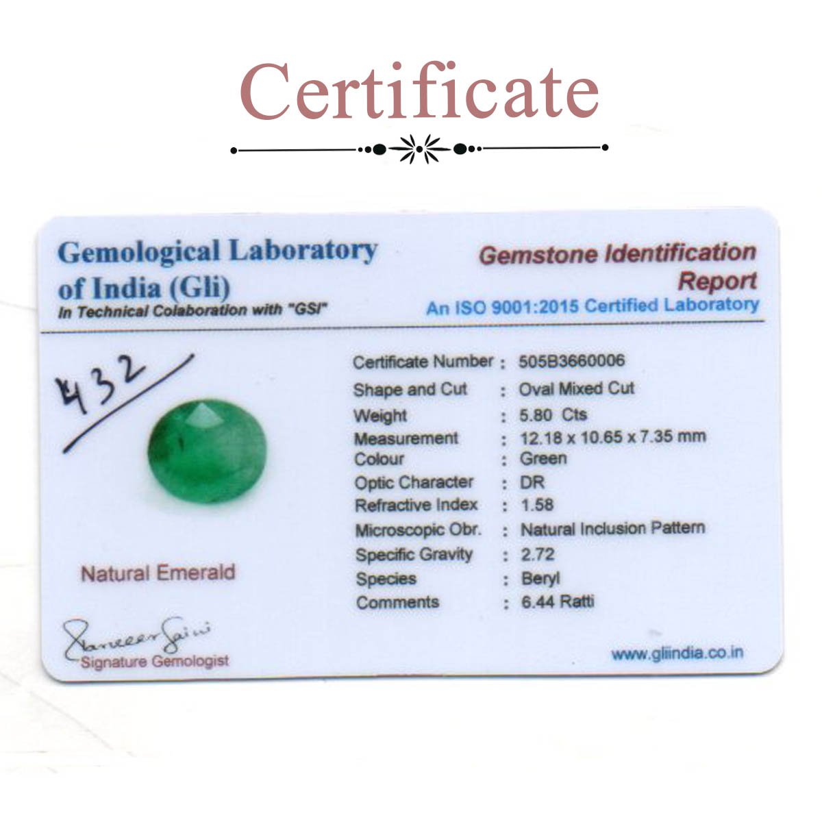 5.8 Carats Emerald ( 6.44 Ratti Panna )