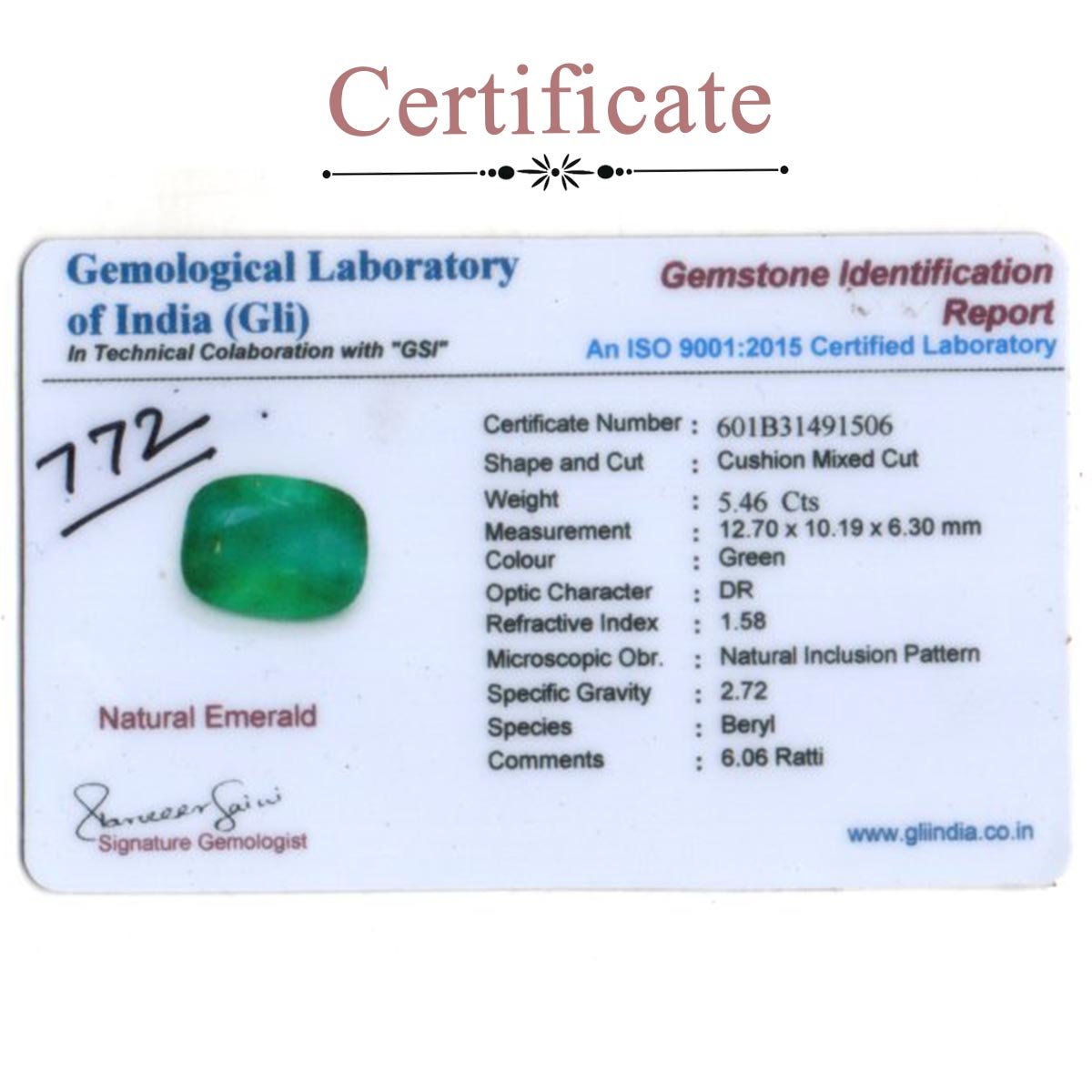 | Certification | Certified from GLI (Gemological Laboratory of India) |