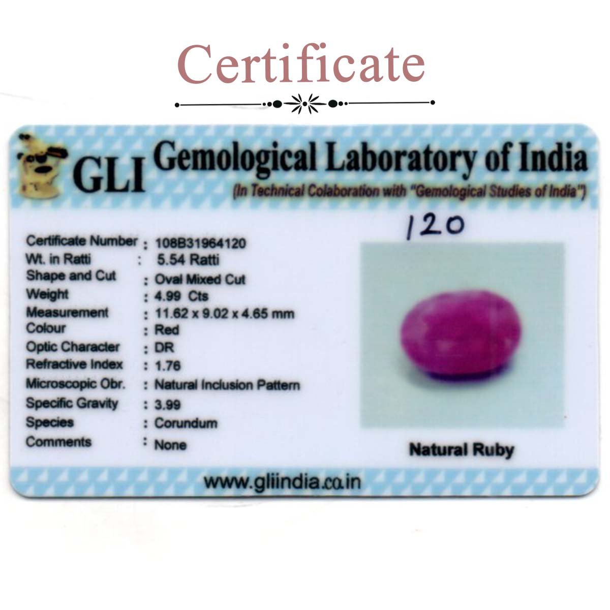 4.93 carats Ruby Heated ( 5.48 ratti Manik ) Original price was: ₹66,555.00.Current price is: ₹56,695.00.