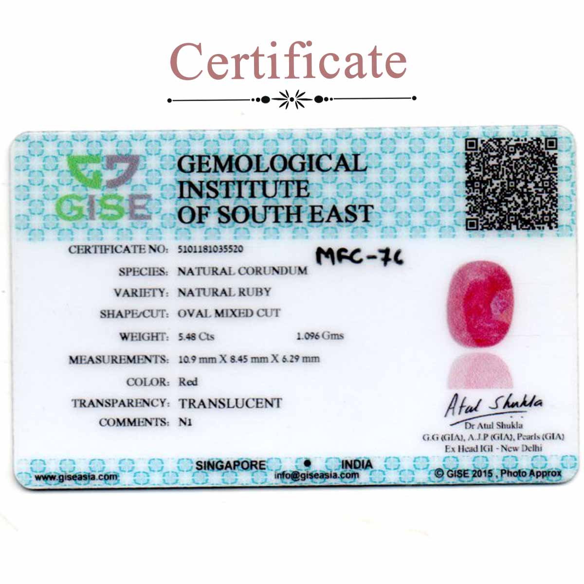 5.48 carats Ruby Heated ( 6.09 ratti Manik )