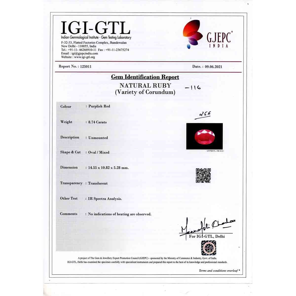 8.74 Carats Ruby ( 9.71 Ratti Manak )